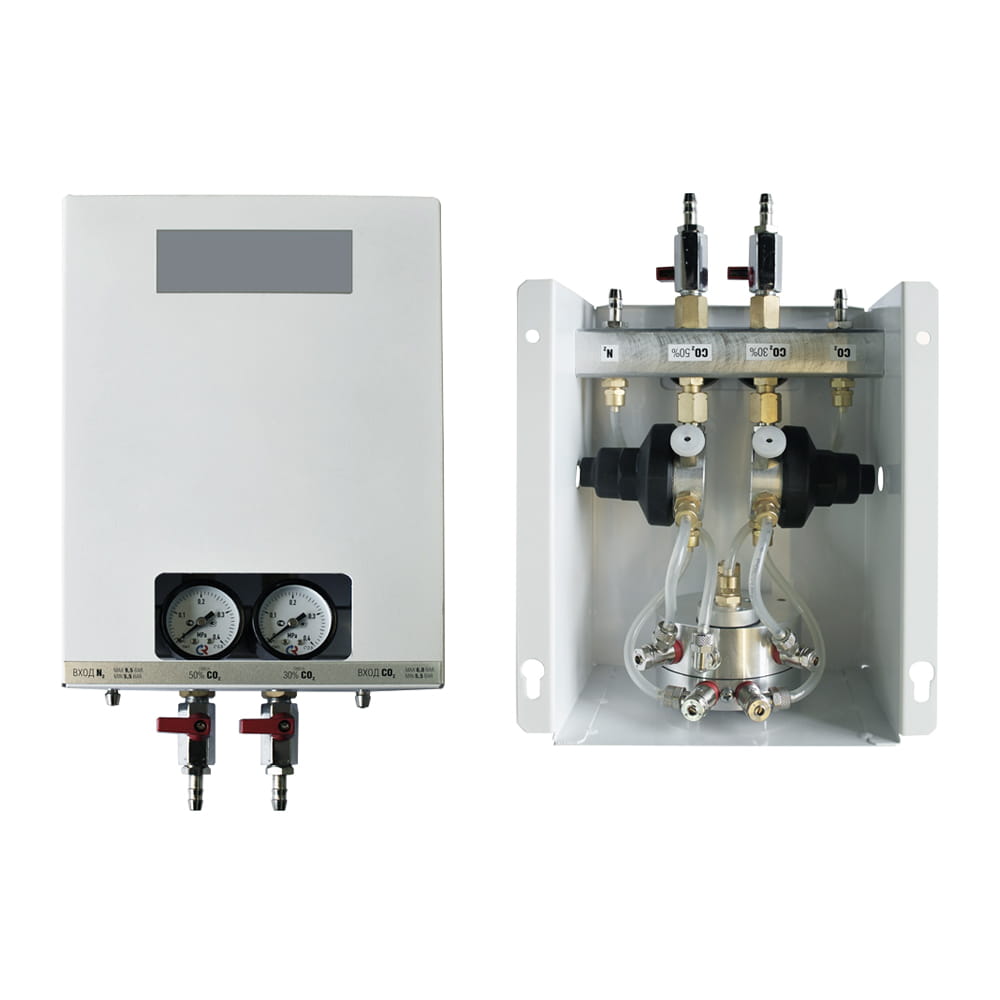 Оборудование смешивает в пропорциях 30% СО2 и 70% N2 в первом канале и 50% СО2 и 50% N2 во втором канале. Оборудование устанавливается на стену. Корпус металлический. Используется в барах, пабах, в пивных магазинах.