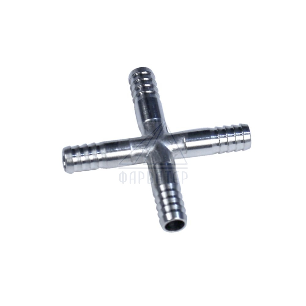 Металлический разветвитель 1 вход 3 выхода X-образный для соединения шланга при монтаже разветвленной газовой или пивной линии в системе розлива из кег. Разветвитель металлический с насечками на выходе для более прочной фиксации шланга. Диаметр 8х8х8х8 мм. Никелированный.